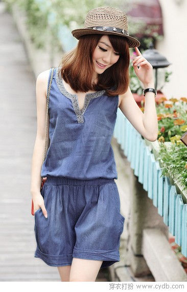 01 清简舒适又美丽有约的一款牛仔连衣裤,出街或出行当然不能少了它的参与,牛仔棉的随意舒适不必细论证,宽松简洁的背心短裤连体拼接,看似无意的随意自然,却在V型领的镶钻细化中隆重异常,轻轻松松就释放出简约不简单,舒适不放纵的美丽自律信号。