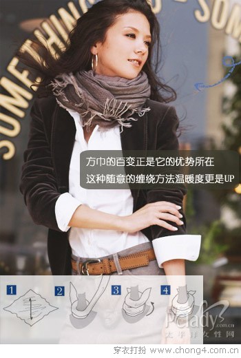 颈部御寒我们都需要一条围巾,同时围巾还是延伸个人时尚度的绝佳单品。系好一条围巾,时尚大方又可以抵挡寒风,一举两得。今天为大家介绍几种简单实用的围巾系法,时间再短也来得及哦: