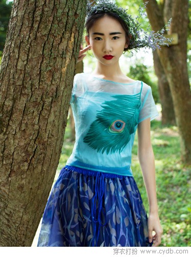 01 绝美的水蓝色上衣仅用一尾孔雀羽毛装点,却华丽得足以让人屏住呼吸。阳光下,外层欧根纱泛着淡淡的柔光,配一袭曳地长裙,好一位超凡脱俗的女子!