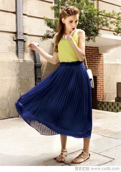 01 如湖水般的幽蓝顺着垂直的线条流淌开去,平静时安详淡然,起风时吹起一层层的涟漪,美到了心坎里。搭配方面选择质地柔软舒适的圆领T恤,比如莫代尔面料,下摆收进裙腰里,修身显瘦还显高。