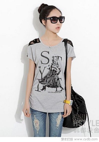 01 T恤+牛仔裤。一件T恤,一件牛仔裤,就能渡过一个不错的夏天。T恤与牛仔裤都是非常百搭的款式,属于怎么穿都不会出错的类型,这两者的搭配非常经典,是夏日街头最基本的搭配方案。灰色的T恤显得比较沉稳,人像印花组合着字母纹时尚不羁,肩部还有镂空蕾丝的装点,展露小性感,整体的感觉颇具街头风,又不失大气风范。