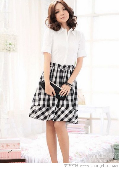 01 格调鲜明的黑白格仔裙摆,造就都市丽人的风范,上身衬衫式的设计,穿出端庄的淑媛味道,搭配黑白格腰带,与下摆相呼应,散发纯净的优雅气息。