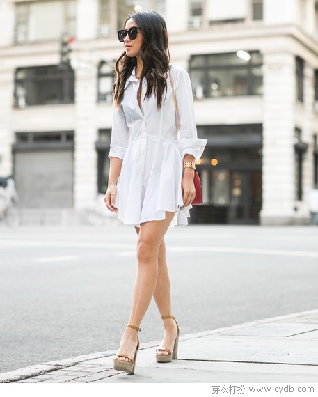 一种颜色:Wendy Nguyen是娇小女生的穿搭榜样,高腰线、不规则裙摆、膝盖以上长度的衬衫裙加裸色高跟鞋瞬间拉高海拔。