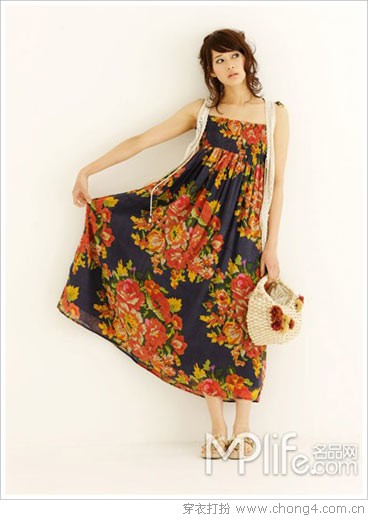 01 大花图案的浓重色调连衣裙,搭配一个清淡的草编包,轻飘飘又充满女人味的感觉。
