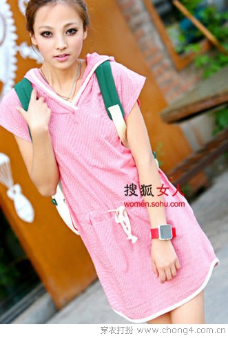 01 细小的红白色条纹,整体呈淡红色,带帽子设计使得衣服增加了不少休闲感。淡淡的颜色衬得皮肤很白很干净哦 。